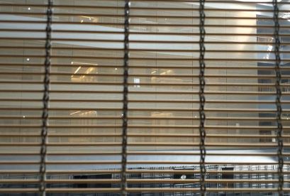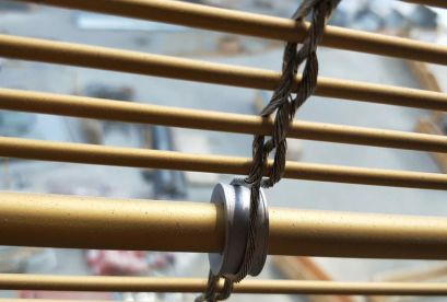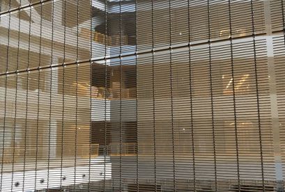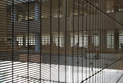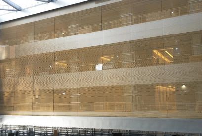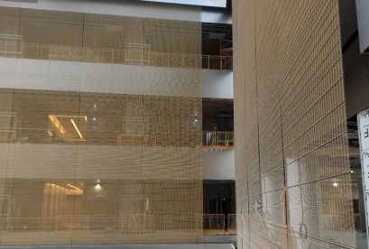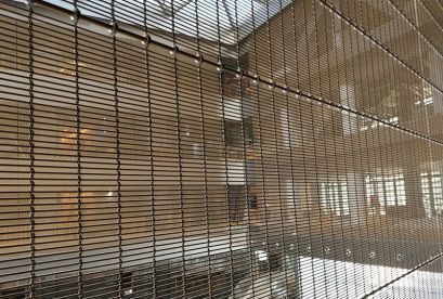 The metal mesh is used for many aspects of this building, such as the stair railing fence(perforated sheet), ceiling system(perforated sheet), and balcony cover mesh(stainless steel decorative wire mesh).